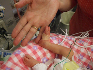 I got to hold Abby tonight which was good. She weighed 1850! She was sucking on her pacifier for a little bit while i held her. Her little nails are growing long. They don't recommend cutting them because of the risk of infection. She will probably have to wear little mittens soon.